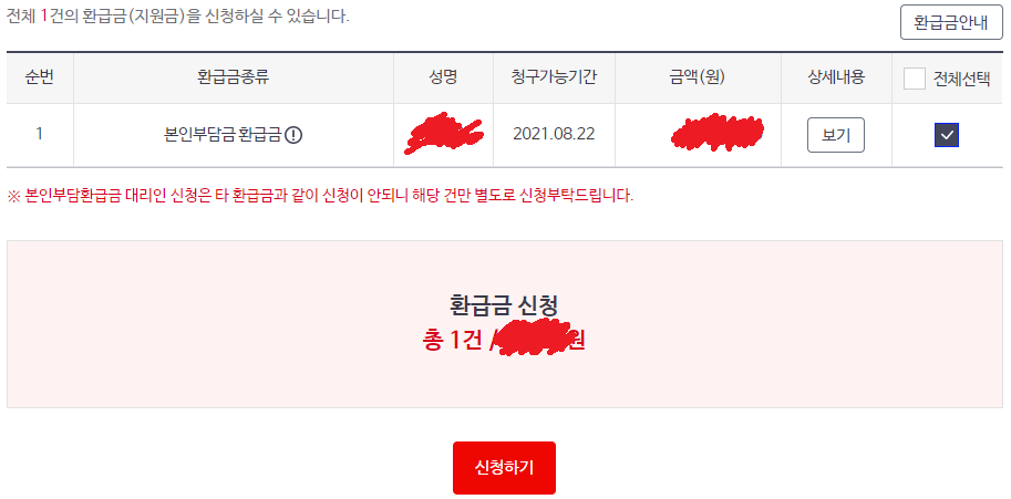 신청하기를 누른 후 지급받으실 계좌 및 개인정보 사항 등을 입력하면 지급받으실 수 있습니다.