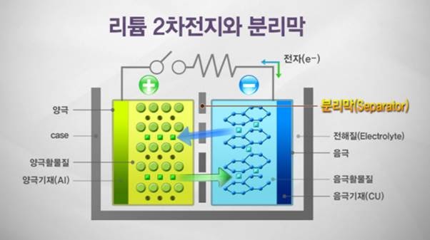 2차 전지도 배터리이다 보니까 건전지처럼 양(+) 극과 음(-) 극이 존재하는데 분리막은 양극과 음극 간의 접촉을 차단해주거나 이동시켜주는 역할을 합니다. 이는 배터리 온도 상승 시 폭발 방지를 비롯하여 충전을 하는 데에도 용이하게 해 주며 2차 전지에서 없어서는 안 될 존재입니다.