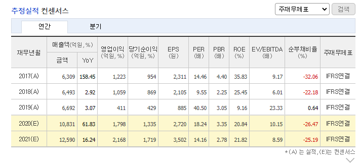 앞으로의 기대감이 높은 기업인 만큼 2021년은 매출이 16%가 상승한 1조 2590억을 추정하며 영업이익 또한 10% 상승한 2168억을 보고 있습니다.