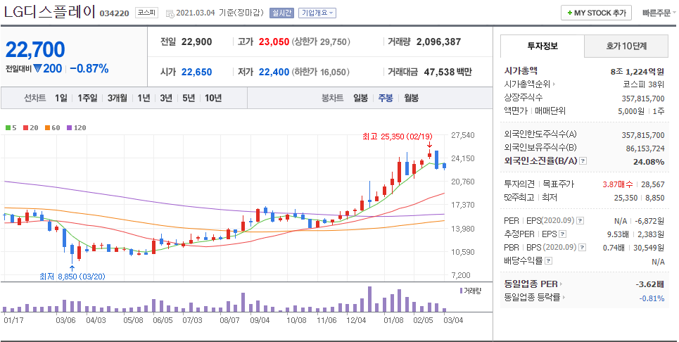 그 중 디스플레이 산업 내 가장 핫한 종목인 LG디스플레이의 주가 분석을 해보겠습니다.