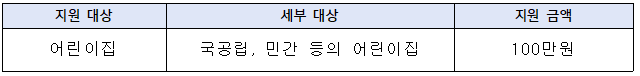 이러한 어린이집에게 100만원을 지급할 예정입니다. 어린이집 대상으로는 국공립, 민간, 가정 등 어린이집 5천개 소가 되겠습니다. 단, 직장 어린이집의 경우 지원금 대상에서 제외됩니다.