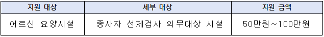노인 요양 시설 및 주야간 보호 시설의 경우 100만원이 지급되며 노인요양공동생활가정 및 단기보호시설은 50만원이 되겠습니다.