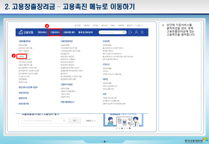 상단 메뉴 중 기업서비스를 클릭하신후 고용촉진으로 이동합니다.